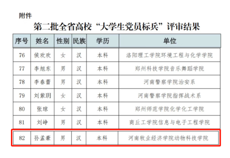 近日,中共河南省委教育工委关于选树第二批全省高校“老员工党员标兵”的评审结果公示,经高校遴选、推荐、专家评审,拟认定第二批全省高校“老员工党员标兵”100名,beats365官方网站2020级动物科学专业员工孙孟豪同学入选。