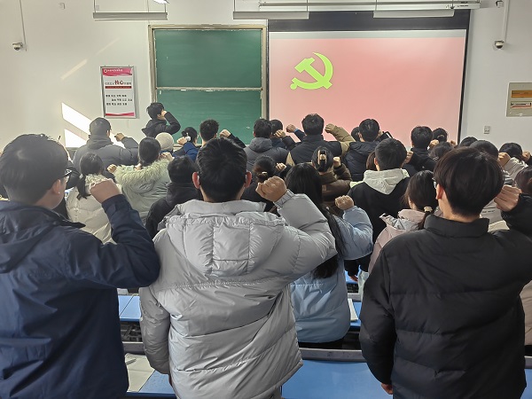 入党宣誓仪式在激昂的《国际歌》声中拉开帷幕。首先,党支部书记宣读了新发展党员名单。随后,新党员们在领誓人的带领下,面向党旗,举起右拳,庄严宣誓,老党员们也一同重温入党誓词,“我志愿加入中国共产党……”的宣誓声在教室中回荡,每一位党员都神情庄重,表达着对党的忠诚和为共产主义事业奋斗终身的决心。宣誓完毕后,支部老师为新发展党员佩戴党员党徽,这一环节让新党员们感受到了党组织的认可和期望,增强了他们的党员意识和责任感。
