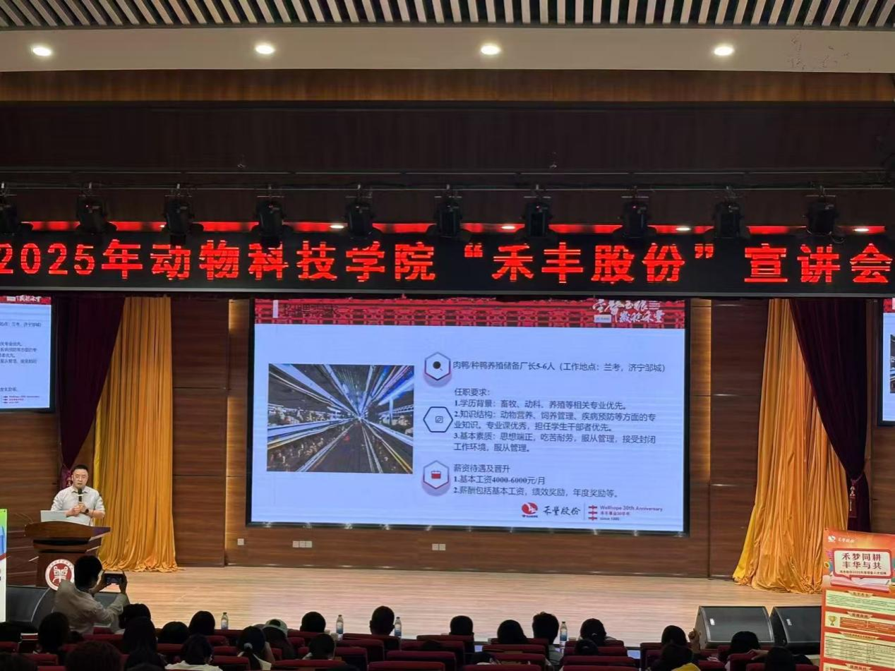 随后优秀员工、河南禾丰总经理薛青飞现身说法并致辞,期间谈到企业发展历程、现状以及个人对集团的渊源和一些人生感悟。精彩的演讲瞬间点燃了同学们对企业的浓厚兴趣,现场氛围热烈。随后肉鸭产业化经理张洪宾针对肉鸭行业格局及岗位需求进行了宣讲,关于肉鸭产业化的发展历程、布局及行业前景,招聘岗位需求及培养和发展体系。通过这些细致讲解,同学们仿佛身临其境,对企业的运作模式和业务范围有了更为直观、深入的了解。